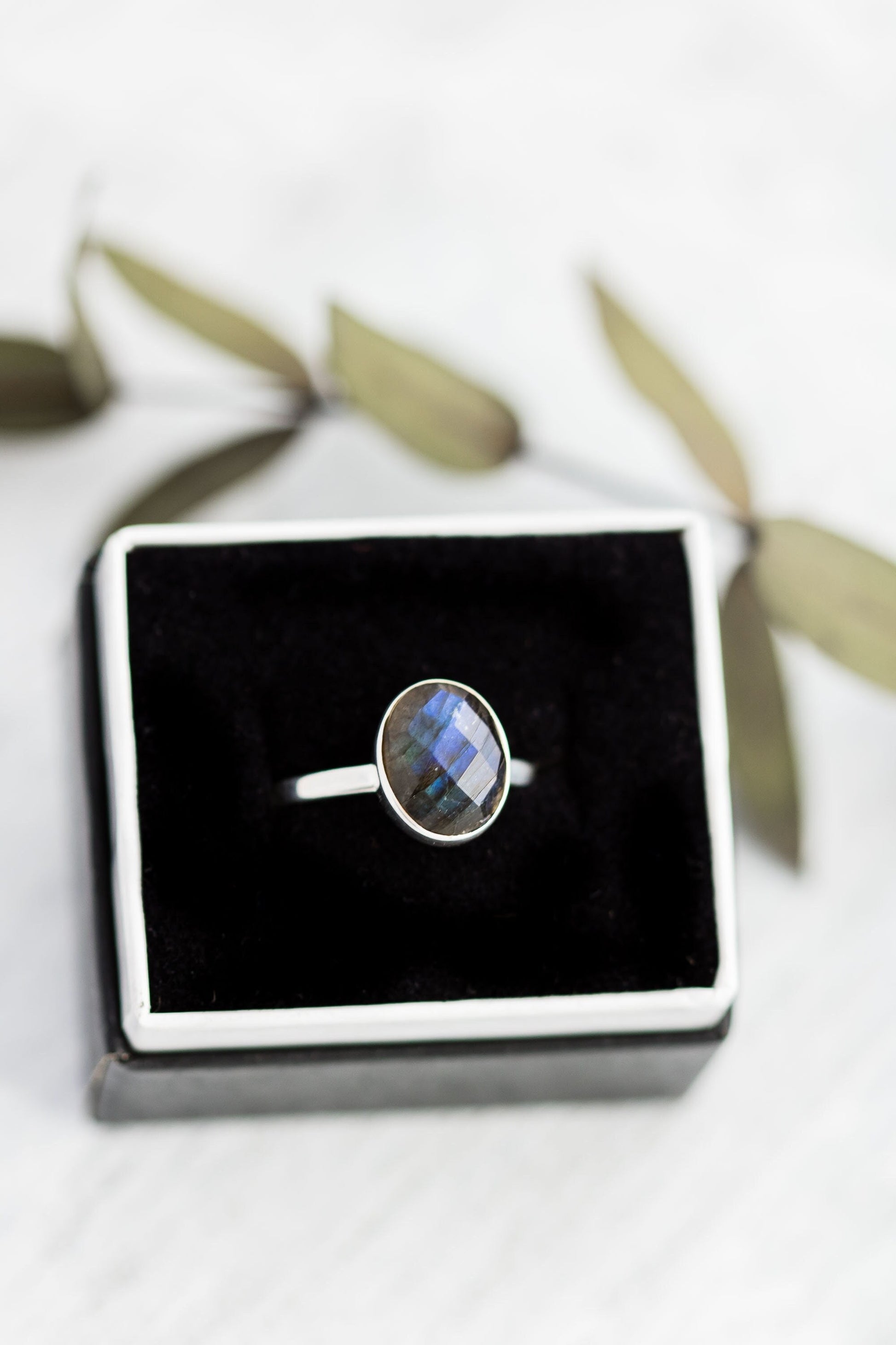 The blue flash of this labradorite is beautiful!! This faceted solitaire gemstone ring is set in a solid sterling silver band. I handcraft each ring in my small Alaska home studio. Each ring is handcrafted and may contain slight variations, a unique characteristic of handcrafted jewelry.